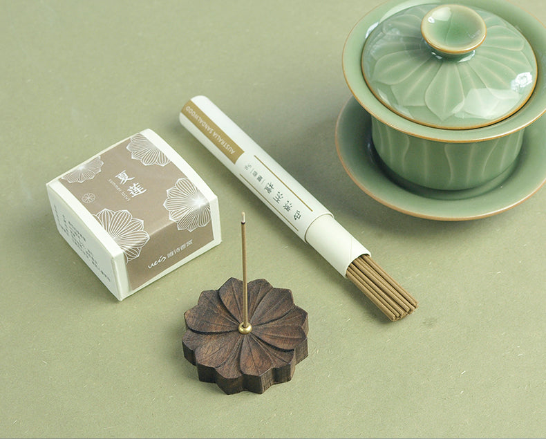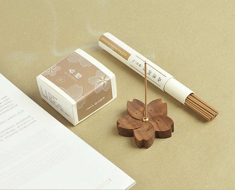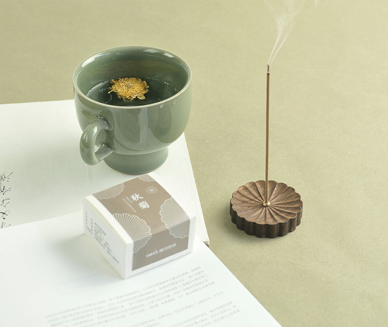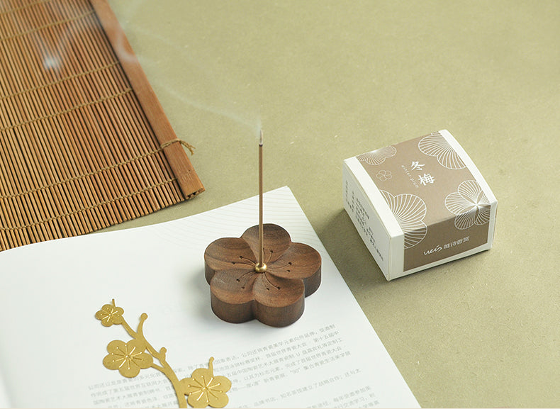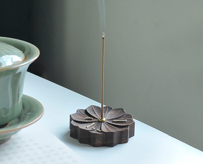 Der Räucherstäbchenhalter „Four Seasons Flower Shape“ aus Walnussholz verfügt über einen Räucherstäbchenhalter aus Kupfer. Dieses elegante Stück zeigt Designs, die von Kirschblüten, weißem Lotus, Chrysanthemen und Pflaumenblüten inspiriert sind. Perfekt für die Inneneinrichtung, kombiniert es natürliche Schönheit und Funktionalität, um Ihr Räuchererlebnis zu verbessern.