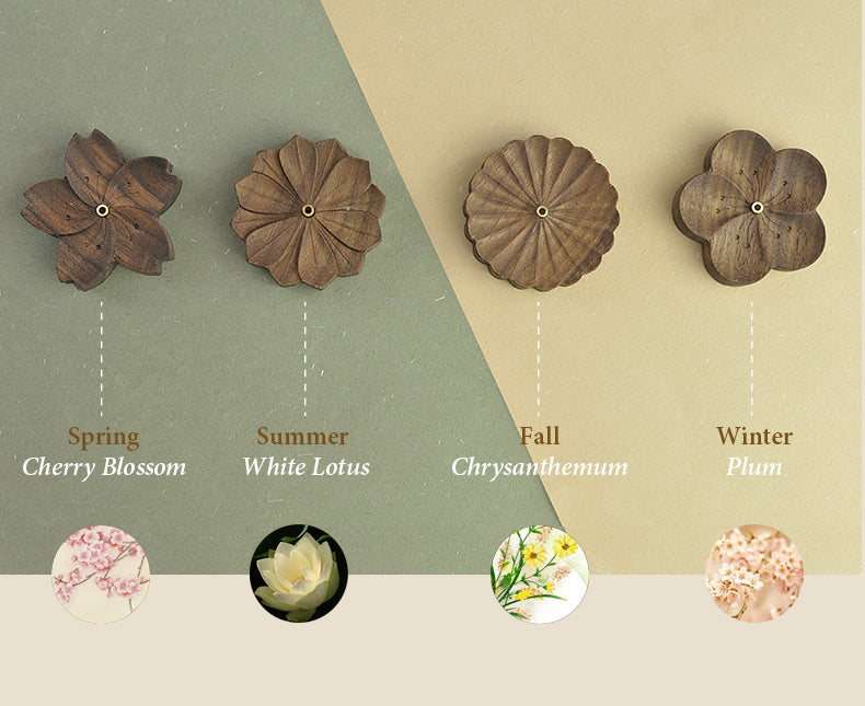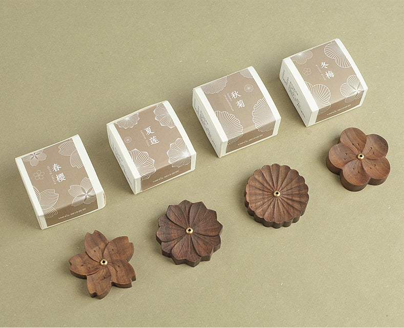 Räucherstäbchenhalter-Platte aus Walnussholz in Blumenform für vier Jahreszeiten mit Kupferhalter – Kirschblüte, weißer Lotus, Chrysantheme, Pflaume