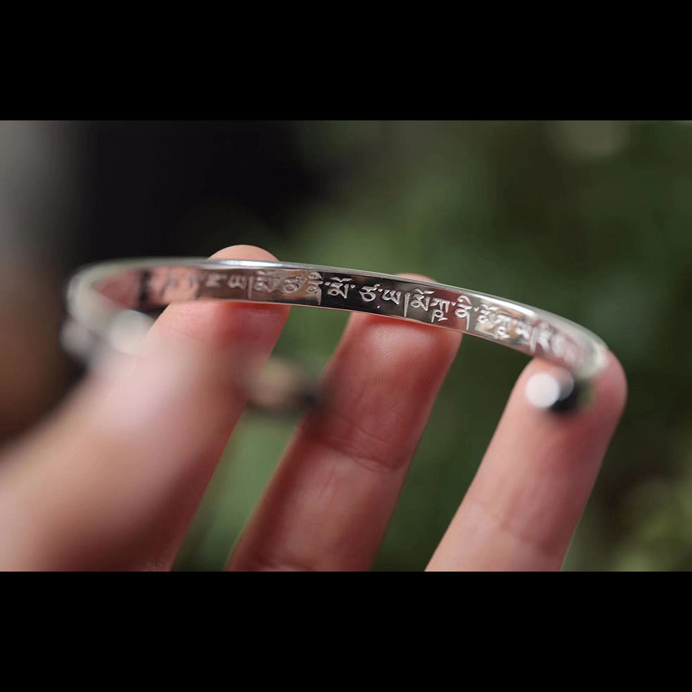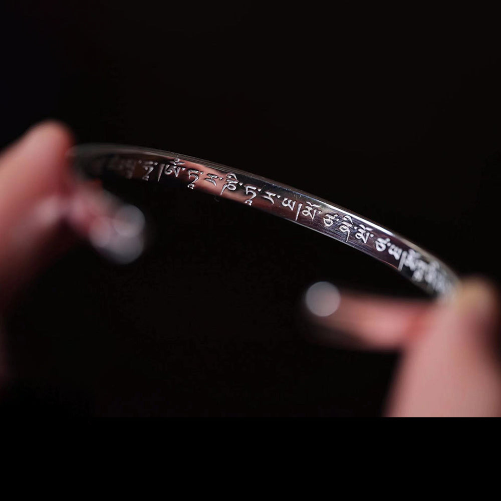 Dieses Sterlingsilber-Armband ist auf der Innenseite mit einem Mantra zum Lösen von Fesseln eingraviert. Das Mantra zum Lösen von Fesseln ist das Hauptmantra der Gottheit Manjushri „Generosity Vajra“, das die karmische Schuld und die Hindernisse besänftigen kann, die sich in früheren und gegenwärtigen Leben angesammelt haben. Khenchen Jigme Phuntsok Rinpoche empfiehlt dem Praktizierenden, dieses Mantra zu rezitieren, um die Hindernisse von Körper und Geist zu beseitigen.