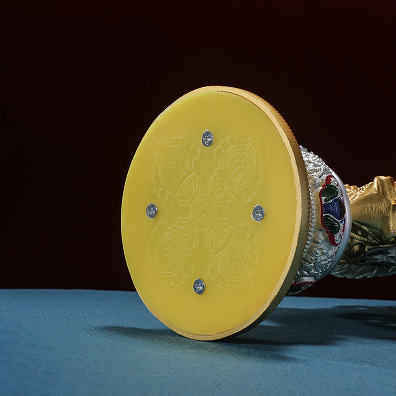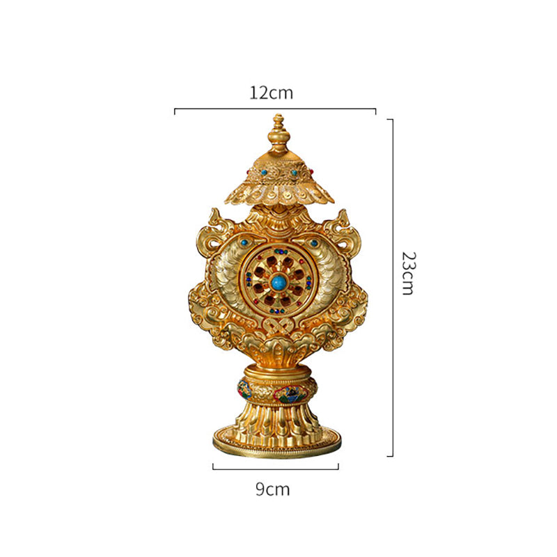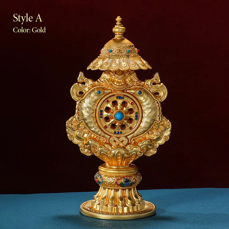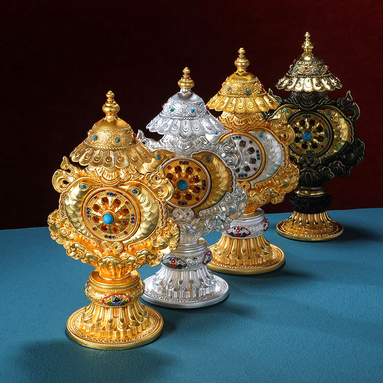 La rueda dorada simboliza lo auspicioso del giro de la preciosa rueda de la doctrina de Buda, tanto en sus enseñanzas como en sus realizaciones, en todos los reinos y en todos los tiempos, permitiendo a los seres experimentar el gozo de las acciones saludables y la liberación.