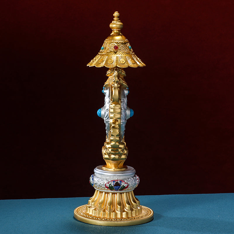 El precioso paraguas simboliza la saludable actividad de preservar a los seres de enfermedades, fuerzas dañinas, obstáculos, etc. en esta vida y de todo tipo de sufrimientos temporales y duraderos de los tres reinos inferiores y de los reinos de los hombres y los dioses en vidas futuras. También representa el disfrute de una fiesta de beneficio bajo su fresca sombra.
