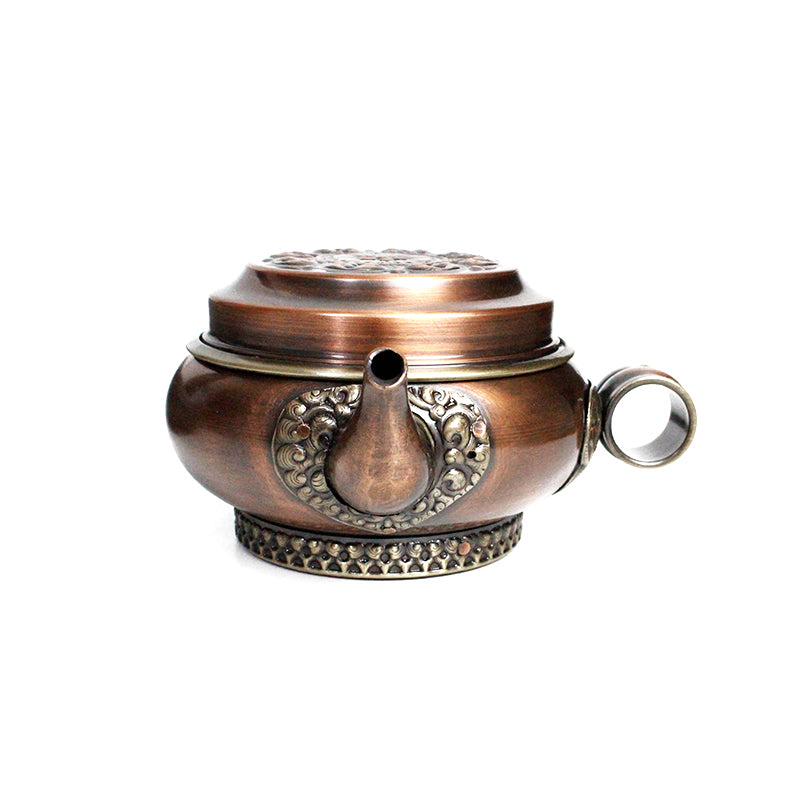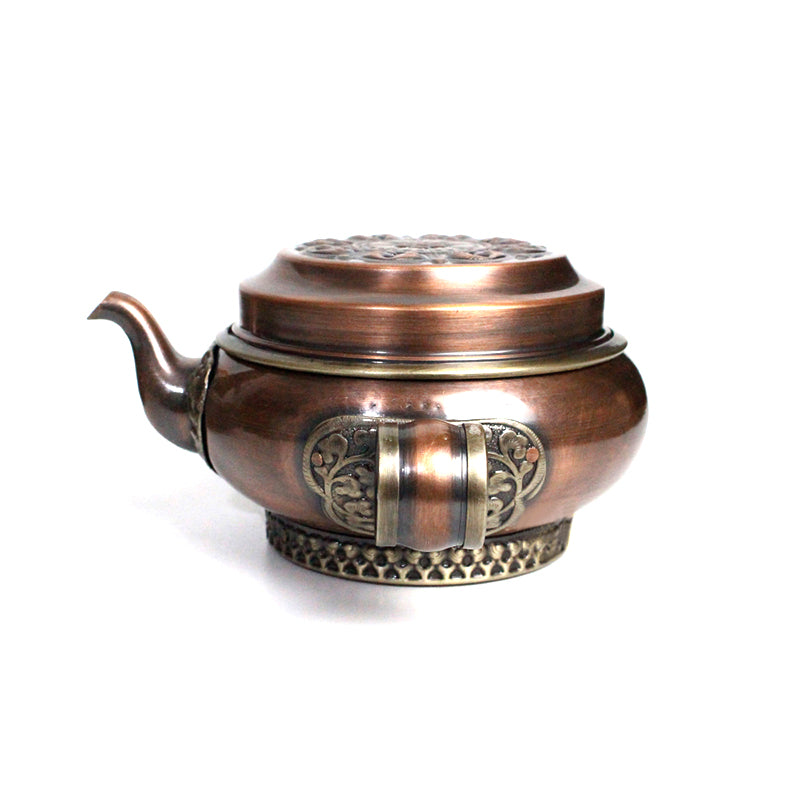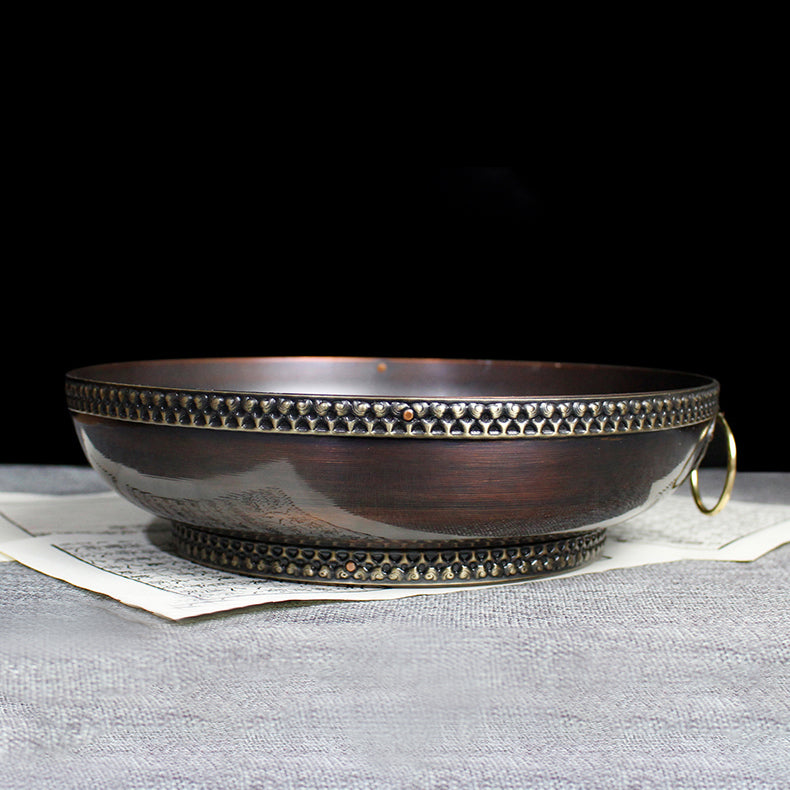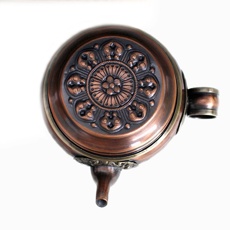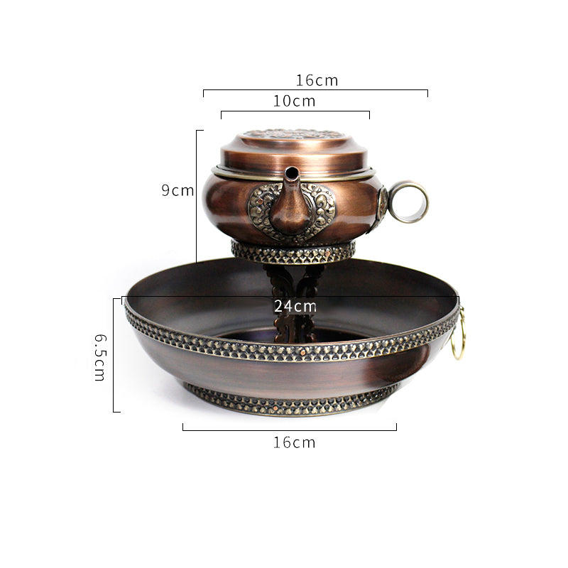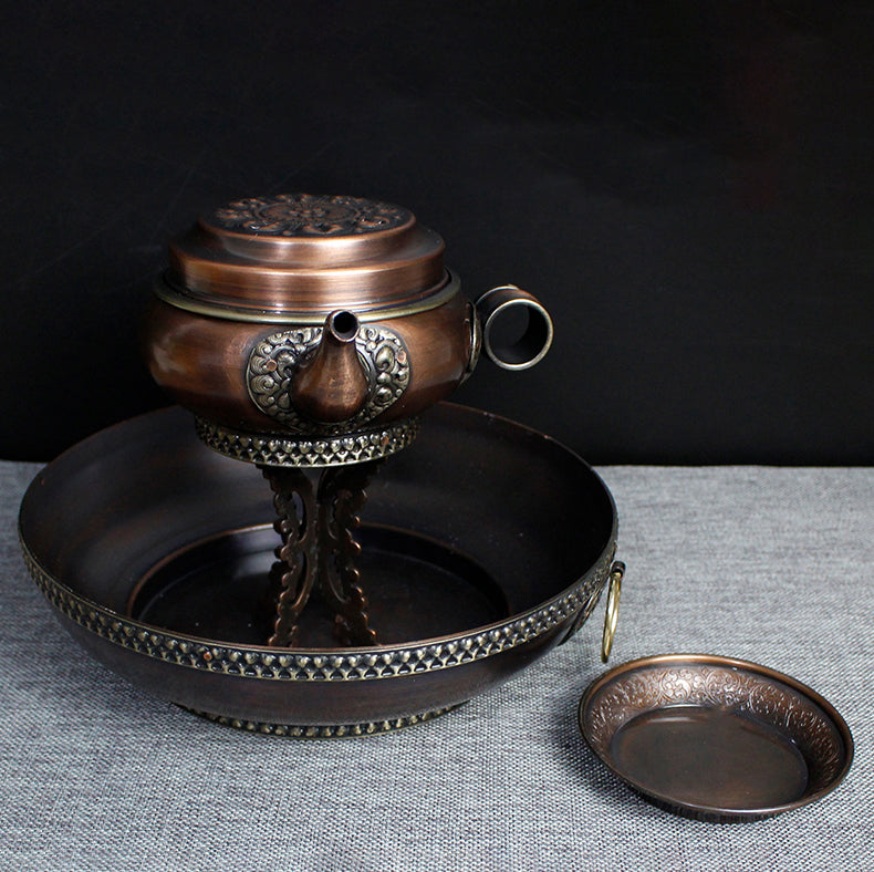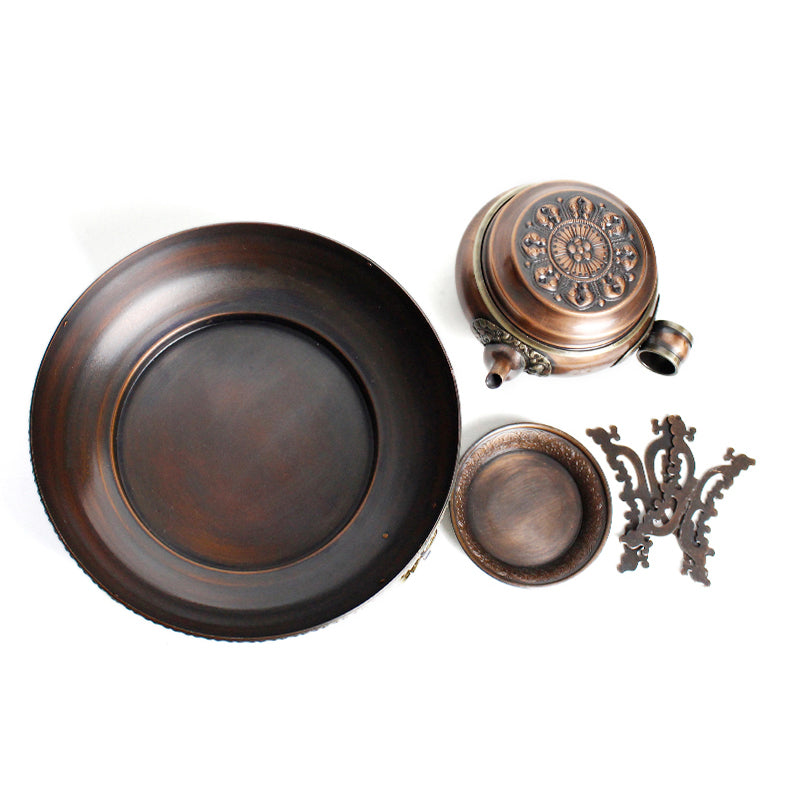 Este conjunto de ofrendas de agua (Chutor) de gran tamaño y alta calidad se utiliza en los rituales budistas tibetanos para hacer ofrendas a deidades de la riqueza como Dzambhala (Jambala) y en otras prácticas de torma de agua. Elaborado con una aleación de cobre de alta calidad con espesor adicional, el cuerpo de la vasija de agua está bellamente tallado con patrones de diversas sustancias de ofrenda, mientras que la tapa presenta intrincadas decoraciones de pétalos de loto. El asa, la boca de la olla y el plato principal están adornados con motivos florales en alto relieve. Los platos de ofrenda y el soporte para platos desmontable se pueden guardar cómodamente dentro de la olla de agua para un fácil almacenamiento.