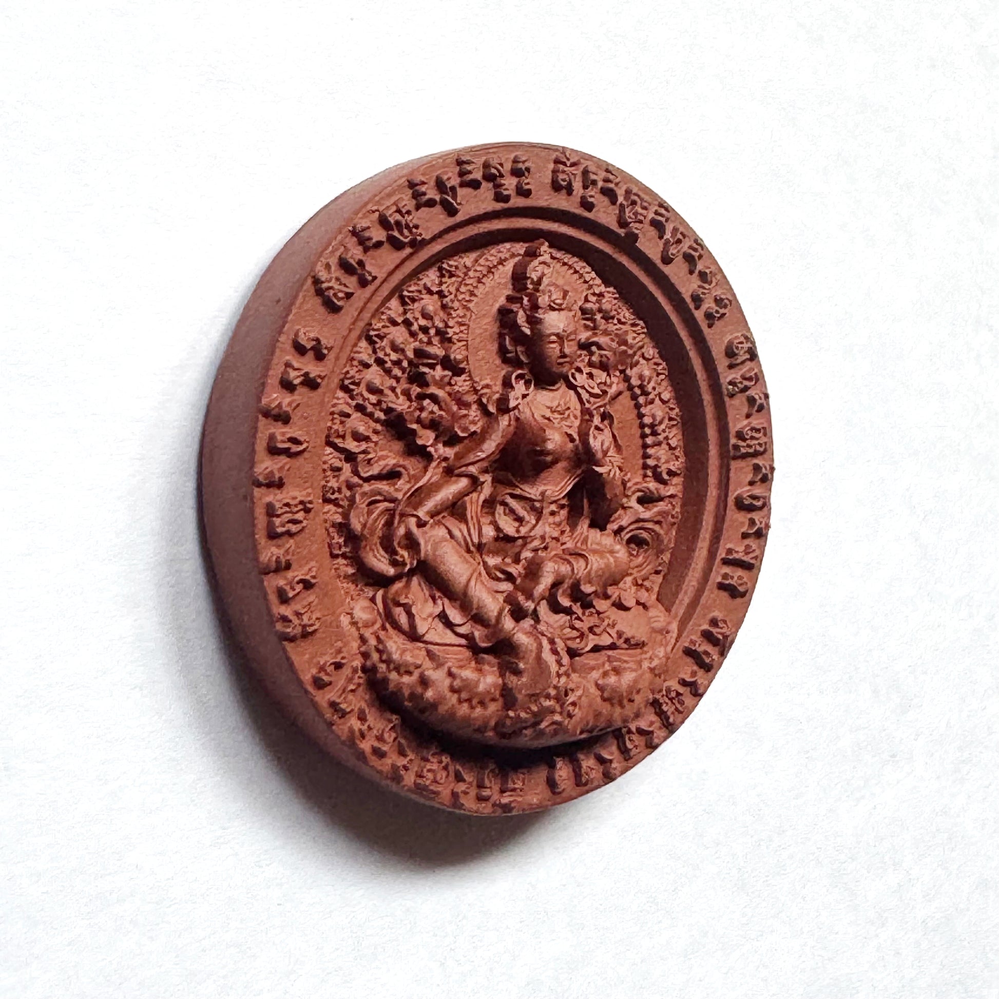 This Green Tara tsa tsa is made with hightly refined clay mixed with  precious mineral including gold, silver, copper, iron and other precious substance like coral, pearl and amber and nectar pills. The refined clay is burnt in 1000 degree to make sure the tsa tsa body is hard like a stone. The Green Tara is depicted with meticulous detail and surrounded by the Greent Tara root mantra.