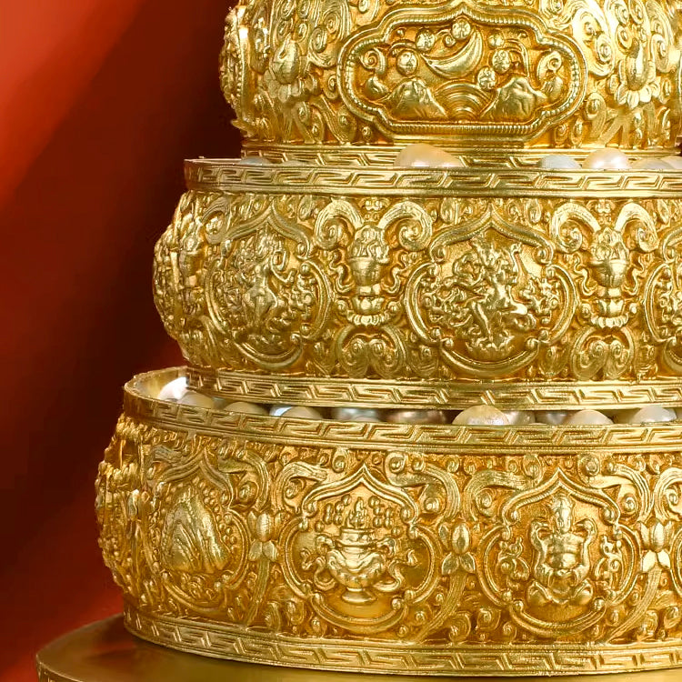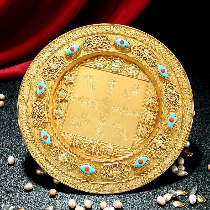Style B, Small Size, Brass Tibetan Buddhist Religious Offering Mandala Set with Stand for Altar Shrine, Exquisitely Detailed with Eight Auspicious and 37 Offering Motifs