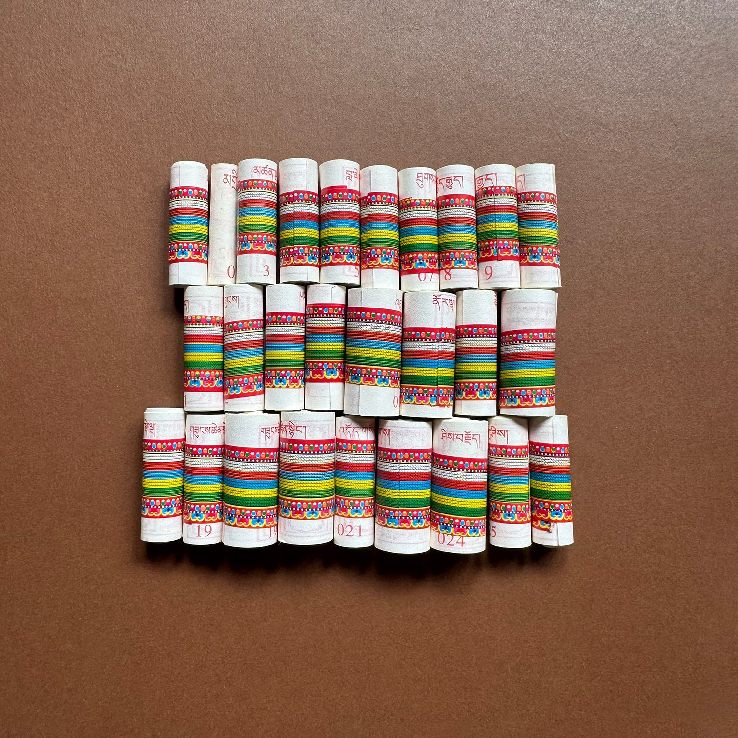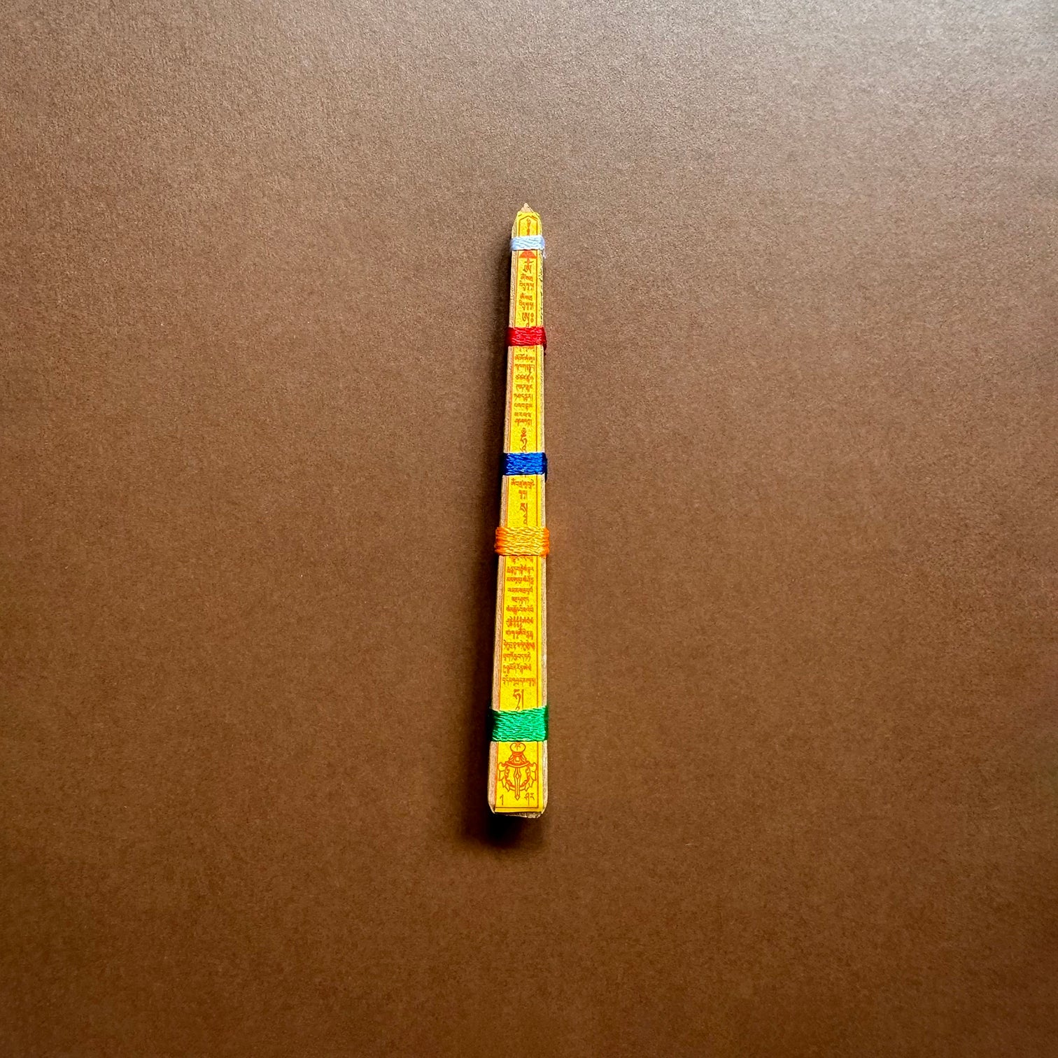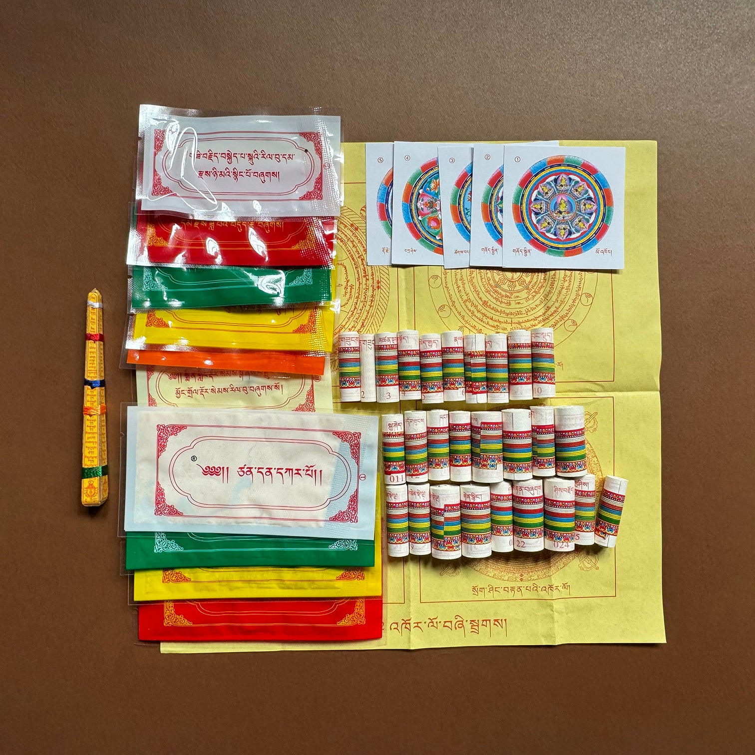 This statue consecration (zung) set contains the wooden central channel, body speech and mind relics pills, collection of blessing substances, essential mantra rolls and mantral wheels.